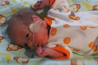 Last Saturday, she graduated from her incubator isolette to an open 'crib'. She has done very well with this and is showing that she can regulate her own temperature, and also not get too overstimuated with noise and light.